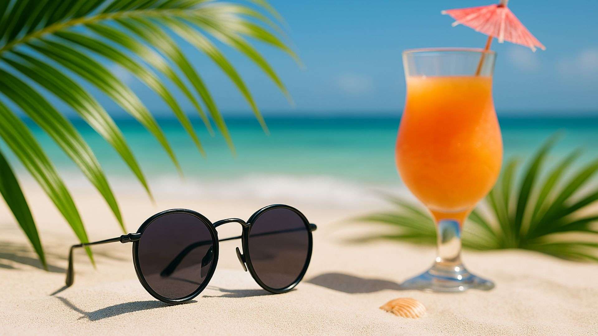 Sunglasses placed on a white sand beach with palm leaves and a tropical drink beside, bright sunlight, summer vibes.