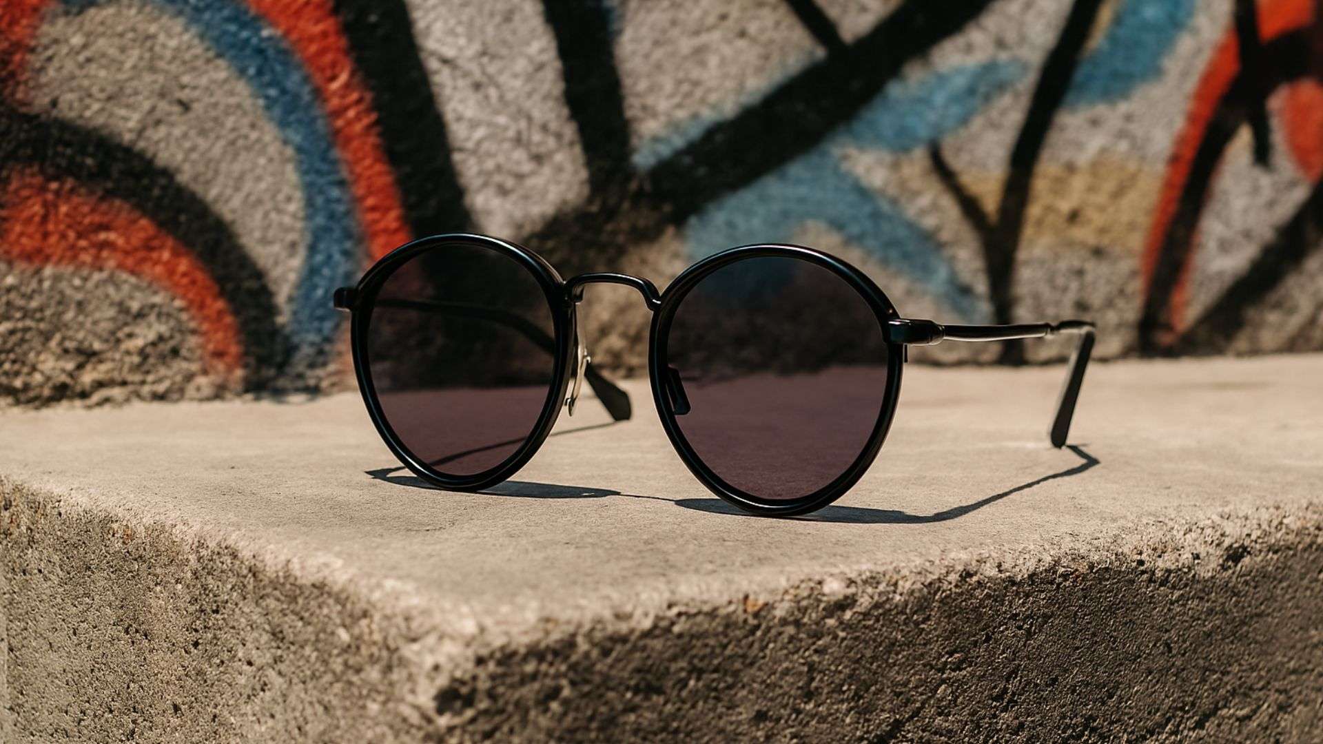 Sunglasses on a concrete ledge with graffiti wall behind, urban streetwear style, harsh sunlight and strong contrast.