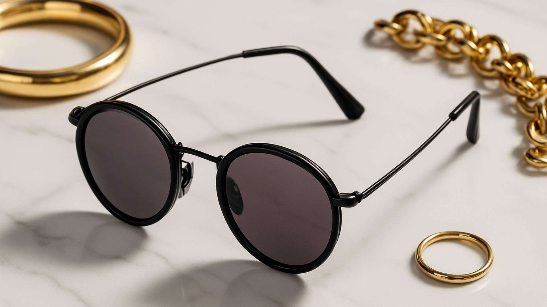A pair of sunglasses on a glossy white marble surface with gold accessories around, soft shadows, editorial luxury feel.