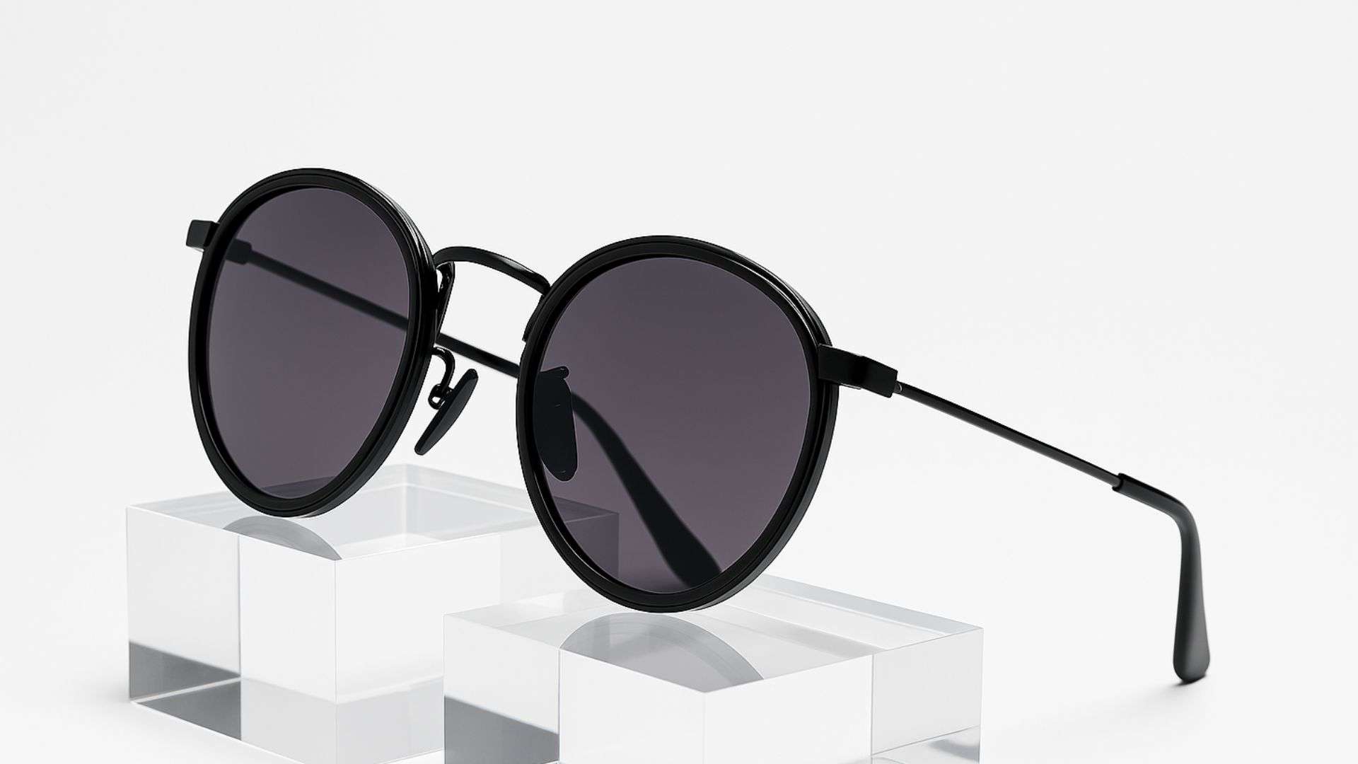 Sunglasses on acrylic blocks under studio lighting, all-white background, catalog photography look with clean reflections.