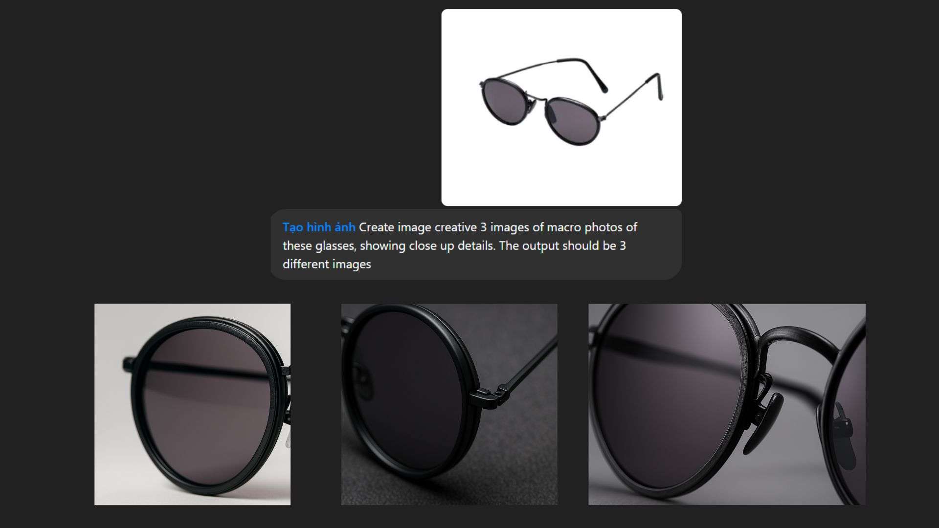 “Tạo hình ảnh sáng tạo 3 hình ảnh chụp macro những chiếc kính này, thể hiện các chi tiết cận cảnh. Kết quả đầu ra phải là 3 hình ảnh khác nhau.”