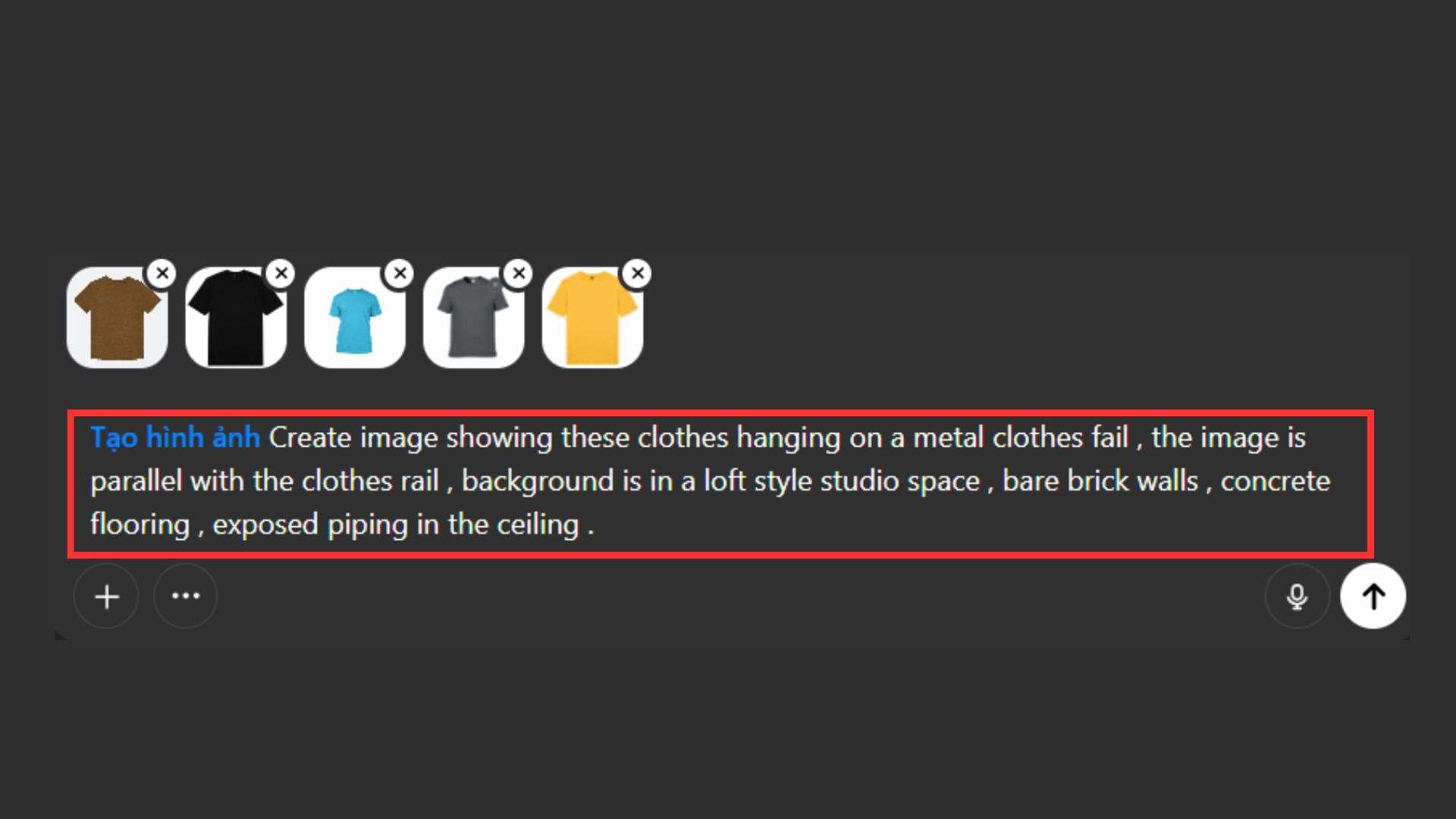 Câu lệnh này có nghĩa là: “Tạo hình ảnh hiển thị những quần áo này treo trên một thanh treo quần áo bằng kim loại, hình ảnh song song với thanh treo quần áo, phông nền là một không gian studio kiểu gác xép, tường gạch trần, sàn bê tông, đường ống lộ ra trên trần nhà.”