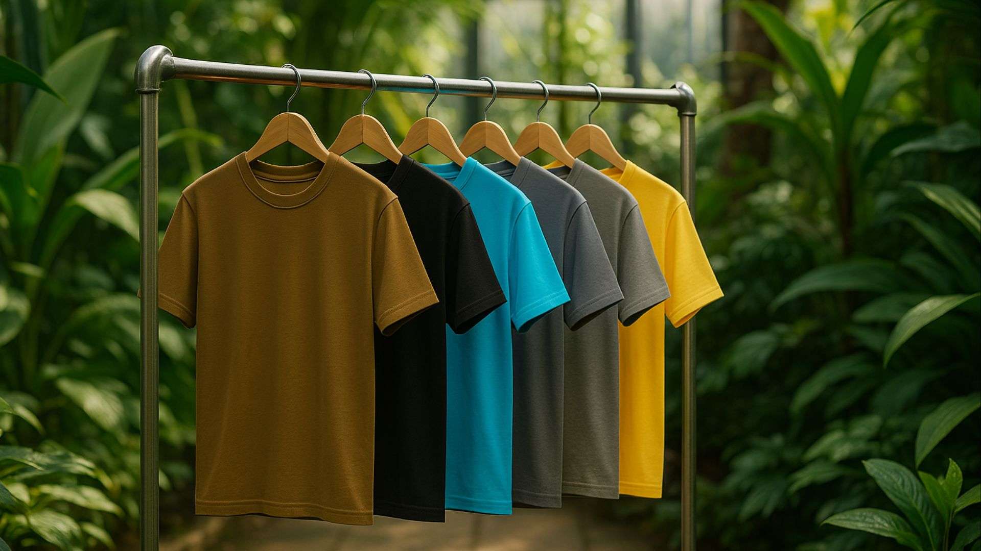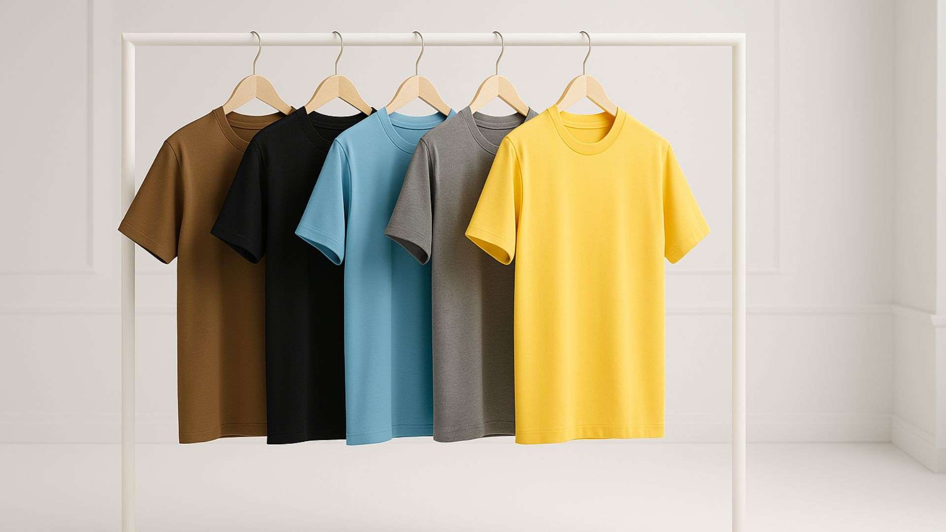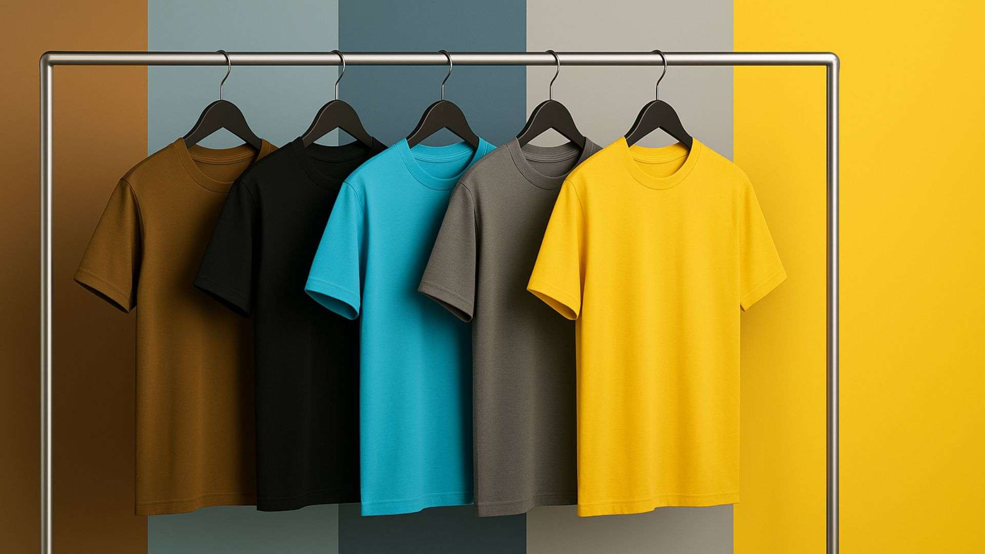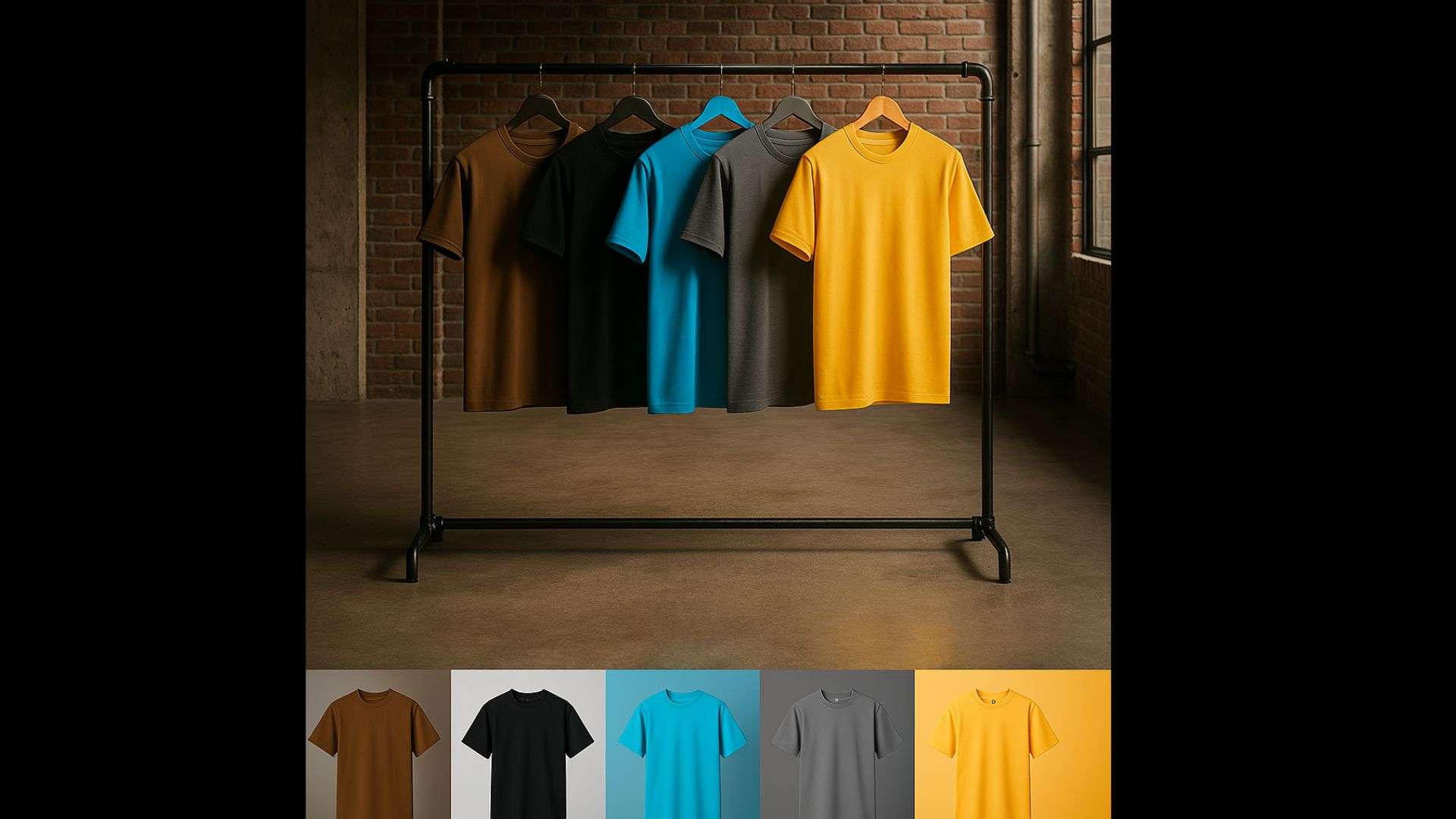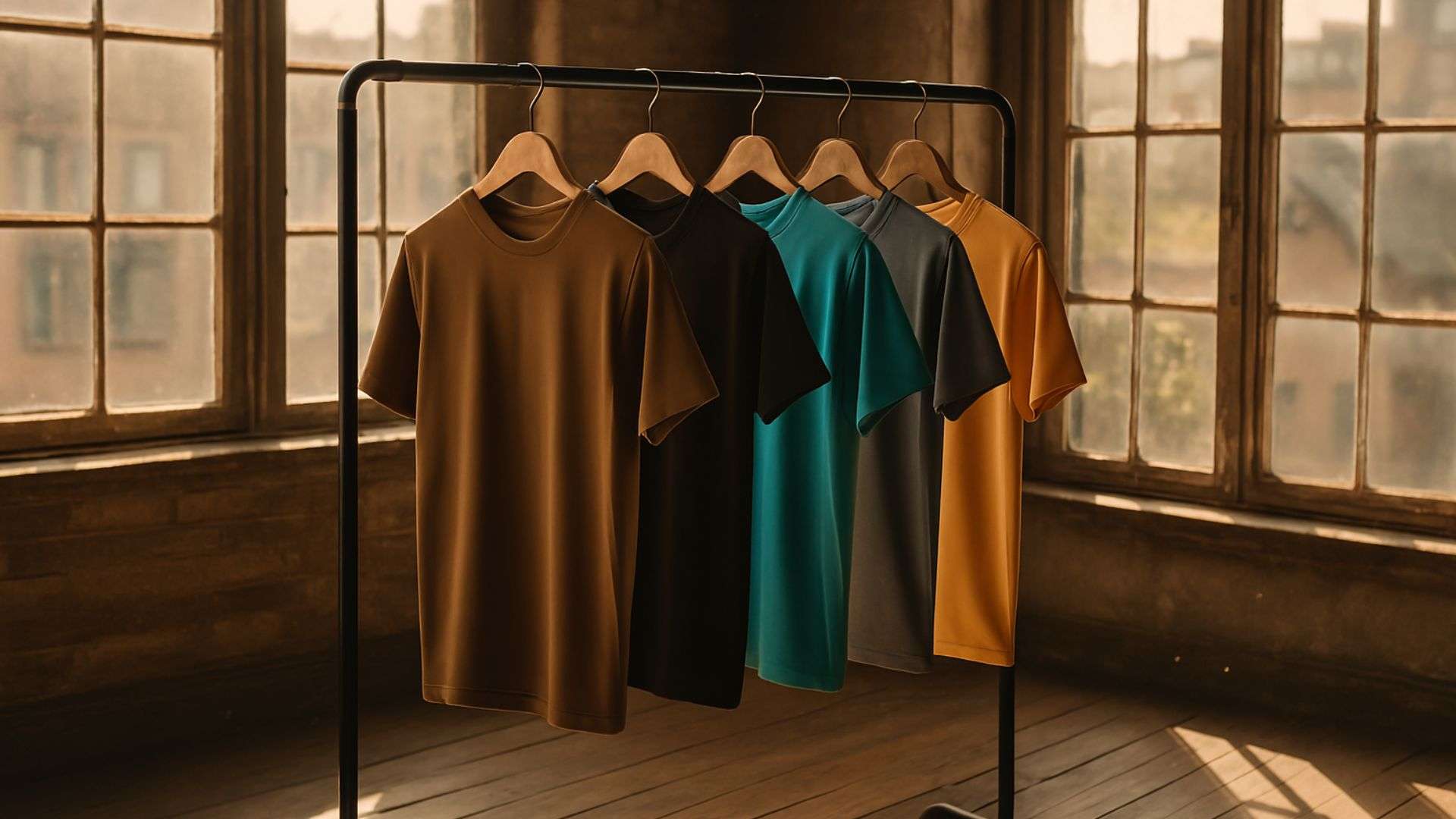 A clean monochrome background matching each T-shirt color, T-shirts hanging on a sleek clothes rack, studio lighting, minimal fashion catalog style