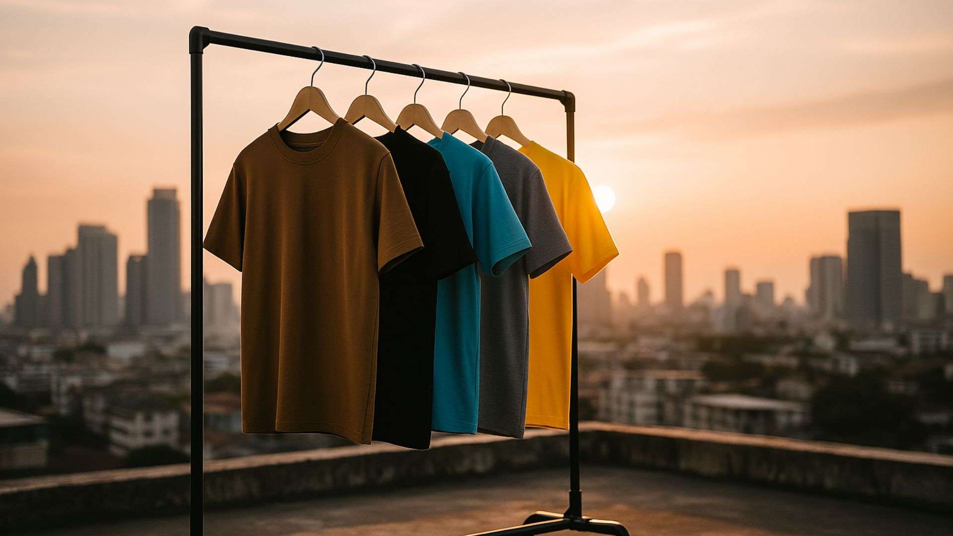 T-shirts hanging on a portable clothes rack on a rooftop under soft sunset light, urban skyline in the background, slightly windy for natural movement