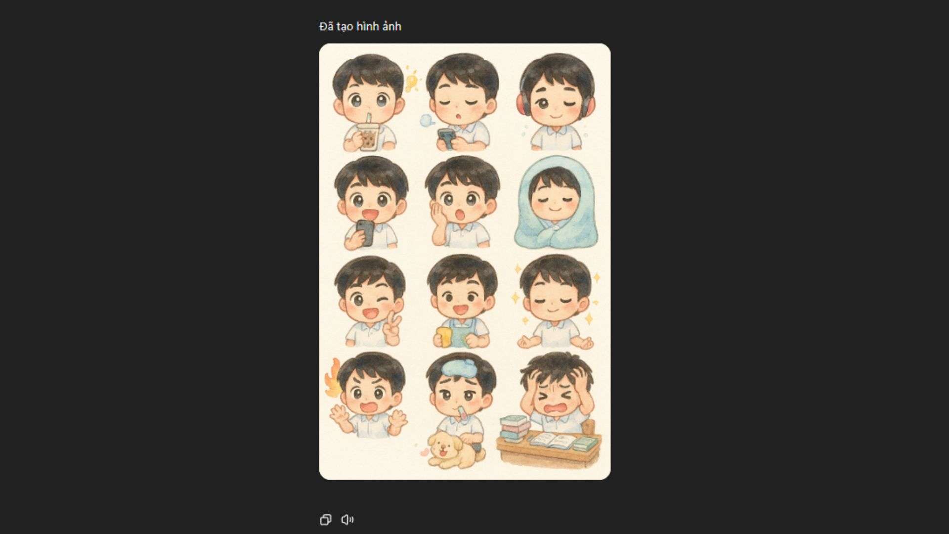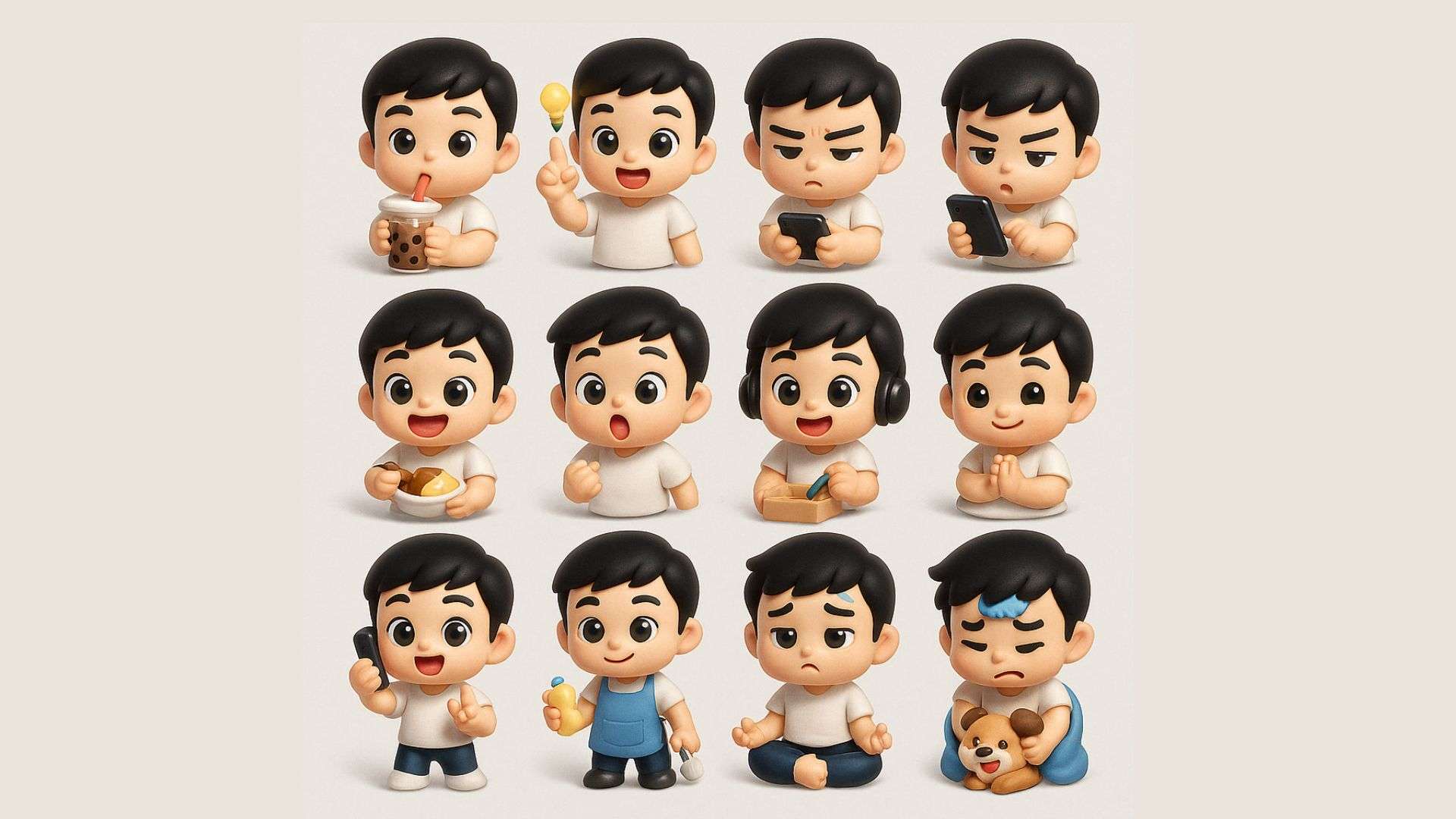 Tạo bộ sticker chibi 3D gồm 4×4 hình nhân vật nam châu Á tóc đen ngắn, mặc áo sơ mi trắng tay ngắn. Phong cách: hoạt hình 3D mềm mại, bóng bẩy như sticker vinyl, tỉ lệ đầu to thân nhỏ, cảm xúc cường điệu. Mỗi sticker thể hiện một hành động như: uống trà sữa, nảy ý tưởng, ngủ, nhắn tin, ăn cà ri, ngạc nhiên, nghe nhạc, quấn chăn, chụp selfie, mở hộp quà, làm việc nhà, thiền, hoảng loạn, chơi với chó, cảm cúm với túi chườm, học bài giận dữ. Có đổ bóng nhẹ dưới mỗi sticker.