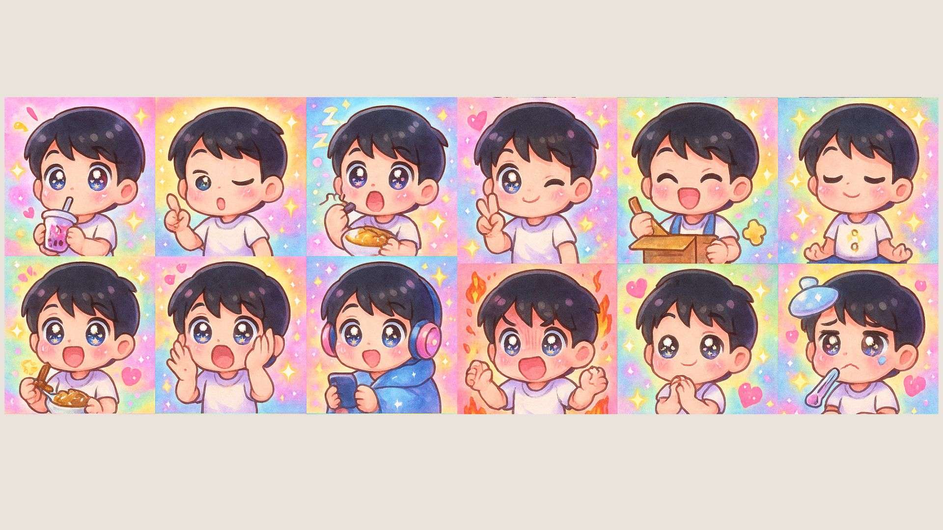 Create a set of 16 chibi stickers of a cute East Asian male character with short black hair and a white shirt. Style: ultra kawaii anime, with sparkly eyes, blushing cheeks, exaggerated emotions, colorful backgrounds with hearts, stars, and pastel elements. Each sticker shows one action/emotion: sipping bubble tea, eureka moment, falling asleep, focused texting, enjoying curry, shocked, vibing to music, blanket wrapped, selfie peace sign, surprised unboxing, cleaning with apron, meditating, freaking out, hugging a dog, sick and sad, angry studying. Backgrounds: vibrant pastel glow.