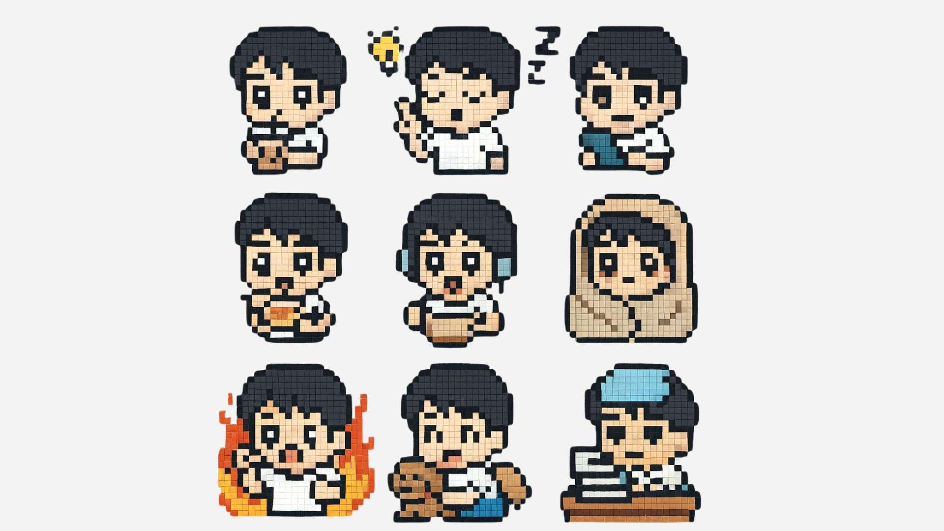 Thiết kế bộ sticker chibi dạng pixel 4×4 gồm một cậu bé người châu Á, tóc đen ngắn, mặc áo trắng. Phong cách: pixel art retro theo kiểu game RPG hoặc đi cảnh cổ điển 8-bit. Mỗi sticker thể hiện một hành động: uống trà sữa, nảy ra ý tưởng, ngủ gật khi ngồi, nhắn tin căng thẳng, ăn cà ri, ngạc nhiên, nghe nhạc, quấn chăn, selfie, mở hộp quà, làm việc nhà, ngồi thiền, hoảng loạn trong lửa, vuốt ve chó, bị ốm, học bài căng thẳng. Nền: trong suốt hoặc khung pixel đơn giản.