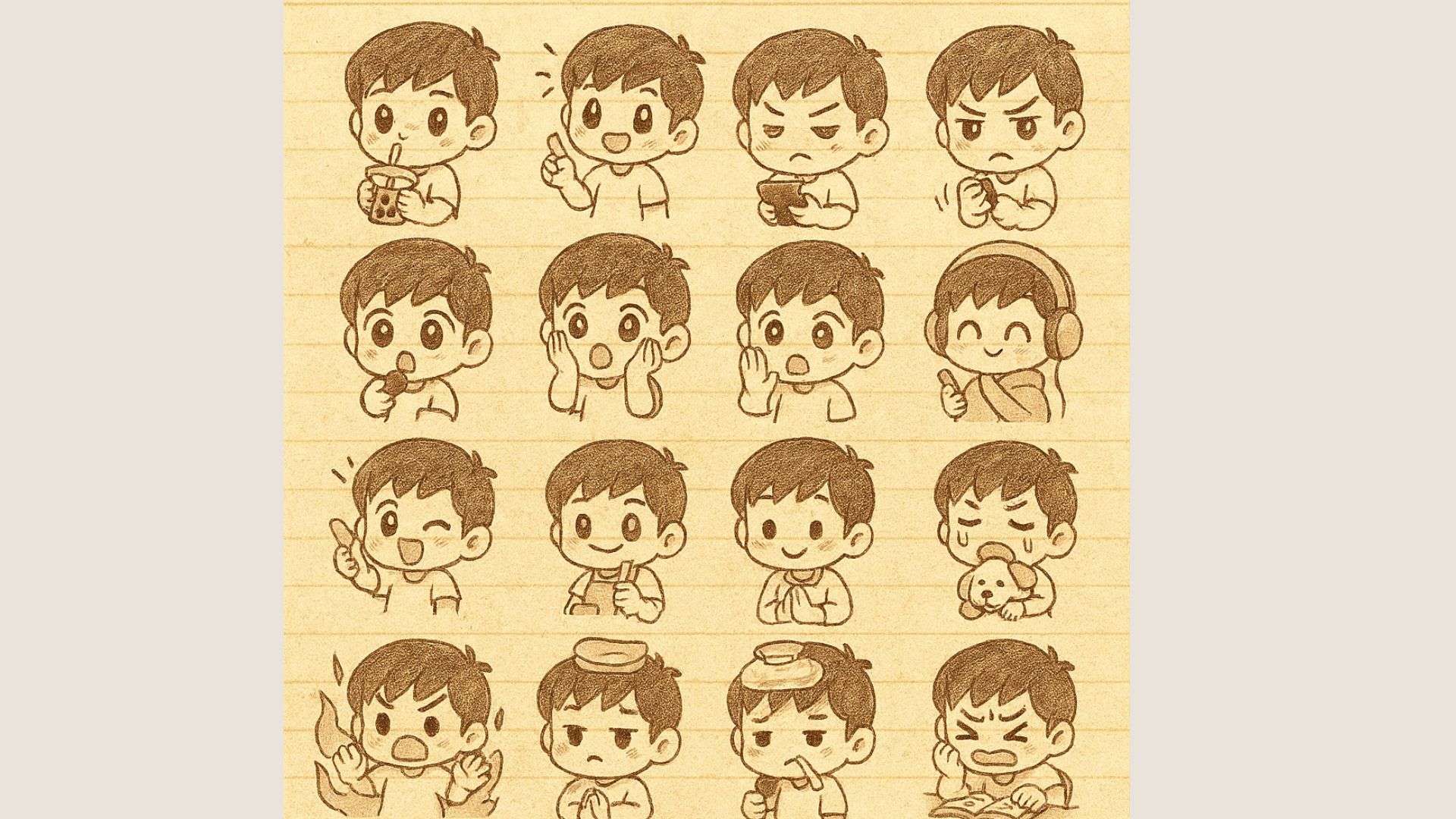 Vẽ bộ 16 sticker chibi bằng tay theo phong cách sổ tay dễ thương. Nhân vật là nam châu Á tóc đen ngắn, mặc áo trắng. Phong cách: vẽ tay bằng bút chì màu ấm, nét mềm mại, nền là giấy kẻ dòng hoặc giấy kraft. Mỗi sticker thể hiện hành động như: uống trà sữa, nảy ý tưởng, ngủ gật, nhắn tin, ăn cà ri, bất ngờ, nghe nhạc, quấn chăn, selfie, mở hộp, làm việc nhà, ngồi thiền, hoảng loạn, vuốt chó, bị ốm, học bài. Thêm hiệu ứng như sticker trong sổ tay học sinh.